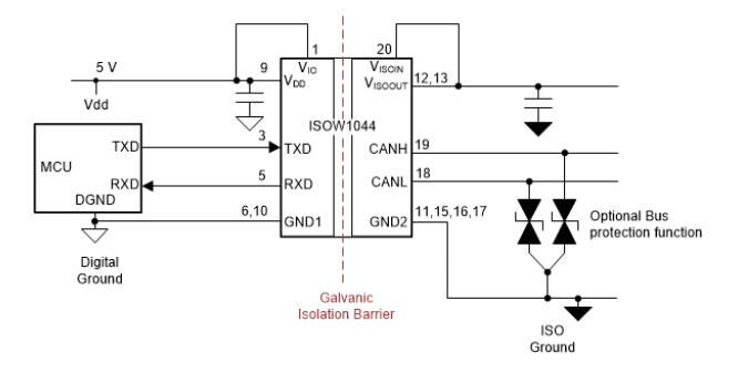 数字隔离器 ISO7721,它提供了一个每个方向的信道用于传输 (TXD) 和接收(RXD)信号,TCAN1042H,故障具有灵活数据速率的受保护 CAN 收发器。
