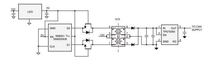 在离散或集成隔离电源实现中,可能存在3.3 V或5 V不容易为一次侧通电的情况。例如,PLC应用可能有24伏电源,而汽车应用可能有12伏电池。在这些情况下,可以在变压器驱动器SN650x之前添加合适的LDO,如图4所示,以将电压降到变压器驱动器所需的5-V电平。变压器由高压电源驱动,选择匝数比在二次侧提供5V,为隔离CAN供电。由于变压器中心抽头连接的电压高于SN650x额定值,因此使用高压FET保护变压器驱动器的输出D1、D2。必须注意调整FET的尺寸,以使RDS(开启)尽可能低,以减少效率损失。